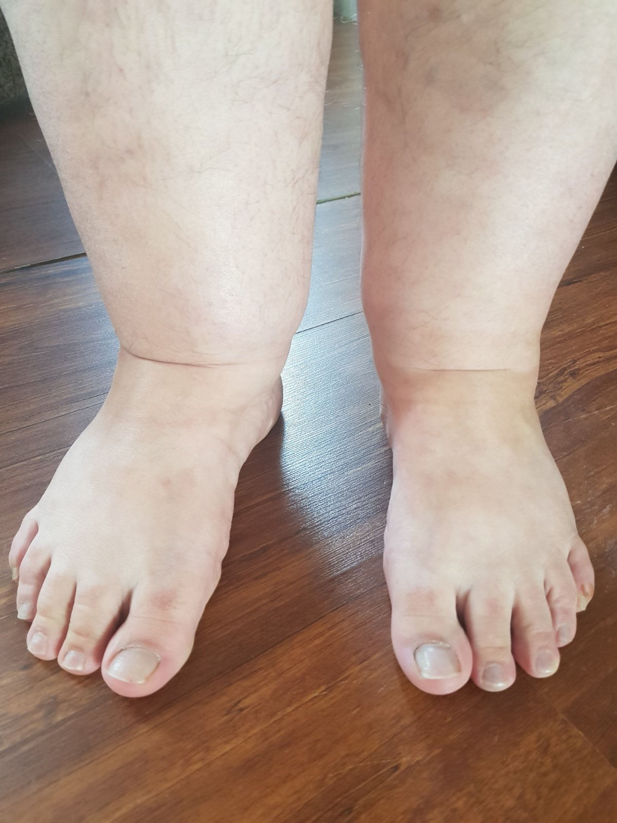 - Пастозність: при натисканні на зону набряку залишаються характерні ямки. Також видно відмітини від гумок шкарпеток або взуття.